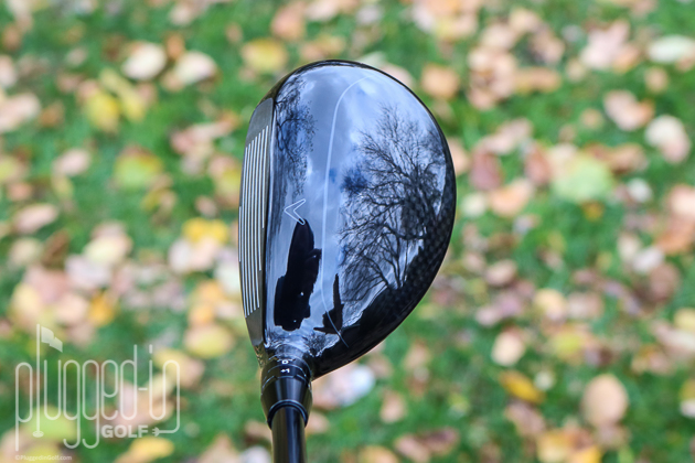 The Callaway Super Hybrid is big. B-I-G, big. It’s not as long from front to back as a fairway wood, but it’s not far off. If you get past the size, this is a really attractive club. The head is slightly asymmetrical, and the chevron alignment aid is centered. Callaway’s signature crown is here, too: a strip of gloss black near the ball with carbon fiber covering the rest of the head.