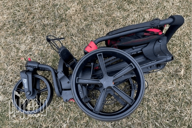 The Big Max IQ 360 push cart folds up small and maneuvers easily around the course with a 360 front wheel. Full review here.