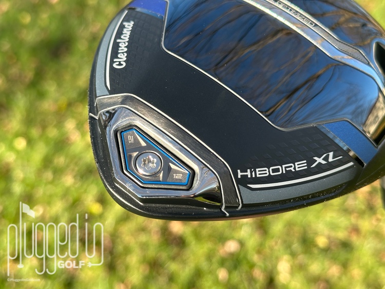 The sole of the HiBore XL driver is very sharp, predominantly a plain mirrored black. “Cleveland” and “HiBore XL” branding are placed toward the toe and heel, respectively. There are two small blue graphics – a color that dominates the head cover – and a removable weight at the very back of the sole.