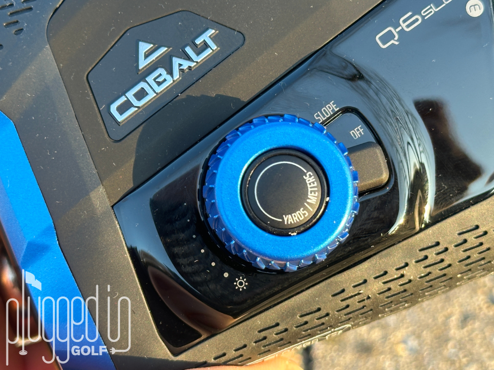 However, everything else about the Cobalt’s user interface is unique. That starts with the blue wheel. This adjusts the brightness of the display – a feature that’s usually buried under several layers of button holds and presses. Next to the wheel is the SmartSwitch that turns the slope adjustment on and off. When slope mode is on, there’s a small red light to let others know that the laser is not tournament legal. Finally, holding the button inside the wheel changes the measurements from yards to meters.