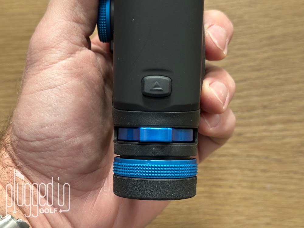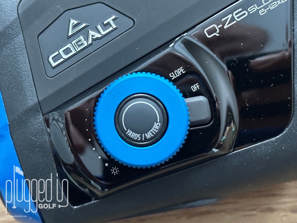 On the left side of the rangefinder (above), you’ll find more controls. Slope compensation is turned on and off with its own switch – a feature I love. You can change from yards to meters with a long press of the round button. The blue wheel changes the brightness of the display. While not the single reason to buy the Cobalt Q-Z6, there’s nothing but upside to making this feature more accessible. Brightness is usually buried deep on the list of menus, if it’s adjustable at all, and being able to change it can prolong your battery life.