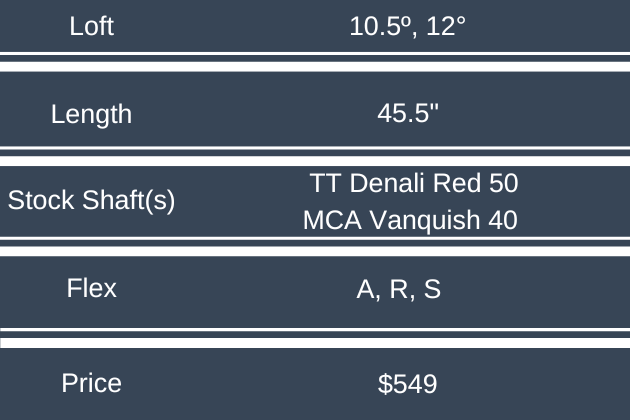 Speed has been central to Cobra driver designs for several years, and it’s worth remembering that Speed is the S in DS. DS is the second generation of DarkSpeed. The Cobra DS-ADAPT MAX-D driver features an updated aerodynamic design and lighter weight stock shafts to maximize head speed. Don’t let the Mitsubishi Vanquish 40 name deceive you – it and the Denali Red 50 are the same 55 grams.