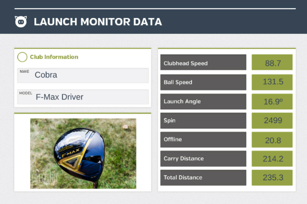 There are two main performance factors that Cobra promotes with the F-Max driver – high launch and straight flight. Reviewing the testers’ data, the lowest launch angle I saw on one shot was 12º, and that player still averaged 15º of launch. Another tester averaged 17º of launch with a 9.5º driver (their data is pictured above). All of our testers agreed that it was easy to get the ball in the air, and they didn’t feel like the ball ballooned on them. Cobra succeeded in delivering an “easy up” club with the F-Max driver.