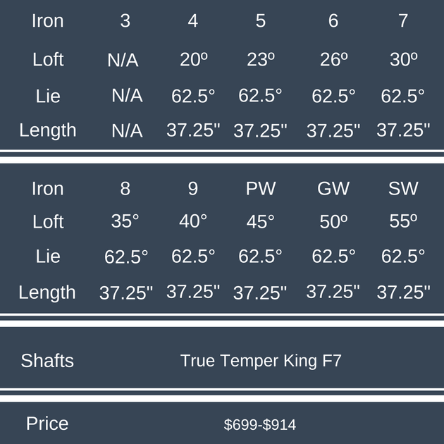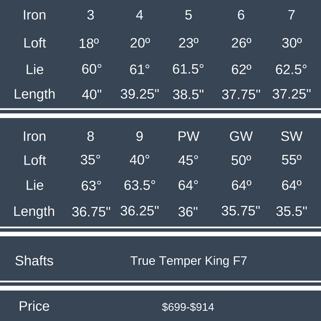 There’s a lot to say about Cobra‘s King F7 iron line this season. First and foremost, the King F7 is available in two configurations – the One Length set as well as traditional Variable Length. The irons themselves are full of technology that make for a great game improvement iron.