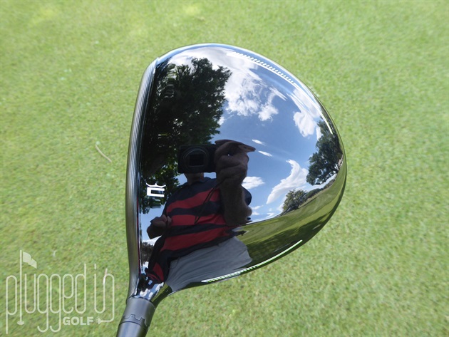 At address, the clubhead is long face-to-back with a hint of triangularity. The deep gloss finish on the black crown is accented with pinstripe graphics and a crowned C alignment aid. Although my photo makes the crown look mirror like, it’s much less so in a true ready position.