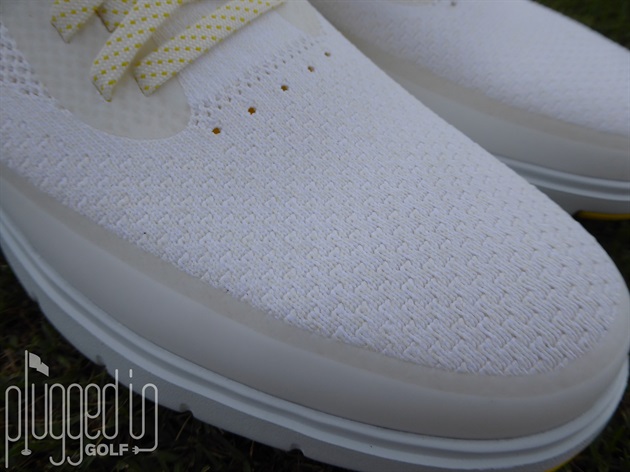 The Generation ZERØGRAND Golf Sneaker certainly fits the basic definition of a sneaker, but it’s far from ordinary in the looks department. From the ground up, the shoes exhibit three distinct layers starting with the segmented thick white midsoles highlighted by bright yellow accents at the toe and heel. Above that, a sleek white strip of material makes the statement that morning dew will not be an issue. The fabric topping off the uppers exhibits wonderfully intricate stitching. Combined, the layers blur the line between athleticism and casual elegance.