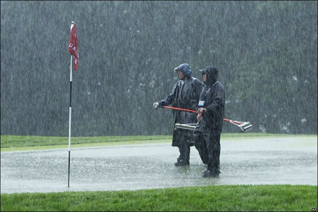 Playing in the rain is, in many ways, like playing in the wind. You need to strike it pure, lower your expectations, and make smart decisions. While being in the rain is usually less pleasant than being in the wind, one benefit is that rain is more predictable than wind so you can worry less about your shots being blown off line.