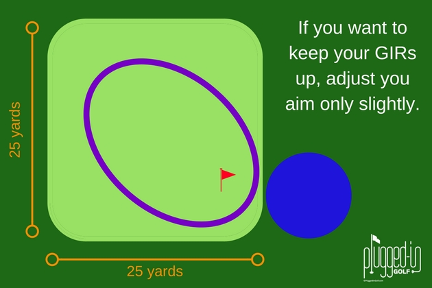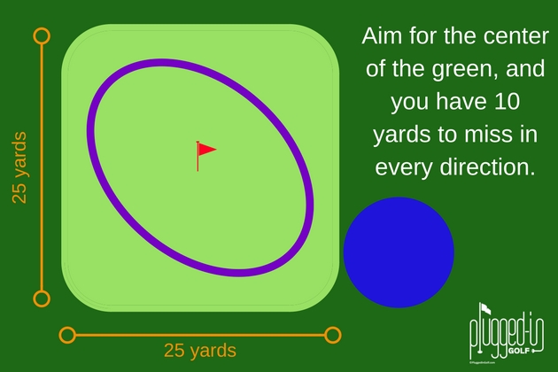 With that in said, let’s think of an average green – square-ish and around 6,000 square feet.  That’s roughly 25 yards long and 25 yards wide.  If we aim for the center of that green, we can miss right or left by 10 yards, come up 10 yards short, or smash it 10 yards long, and still be on the putting surface.  That is a formula for a lot of GIRs and a lot of birdie putts.