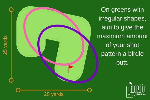 Most greens are not perfect squares.  We have ovals, circles, horseshoes, and every other conceivable shape.  When faced with such a green, we don’t want to blindly aim at the middle (pink, above) because we can end up with putts that aren’t makeable.  We don’t want to center our shot pattern on the flag either.  Aim so that the maximum amount of your shot pattern has a birdie putt.