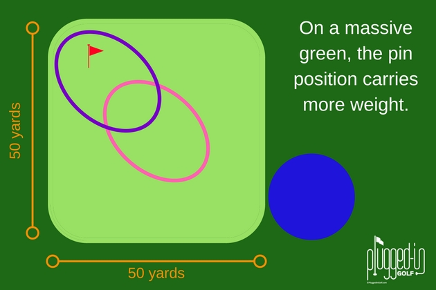 As the greens get bigger, you should give more consideration to the pin position.  In the example above, the green is now twice as big, so our shot pattern looks half the size it did before.  If we aim it at the center (pink), we are going to end up with a lot of very long putts.  While we’re still not going to aim directly at the flag – it’s too near the edge – we can aim much closer to it and still have 100% GIR.