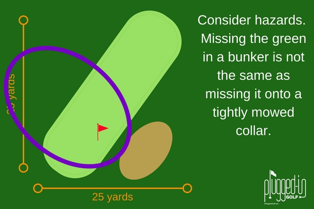 Of course, we also want to take hazards into consideration.  On the green above, we are going to aim long and left of the green.  The center of our shot pattern is barely on the green, but this takes the bunker out of play and gives us a lot of green to work with for a chip.