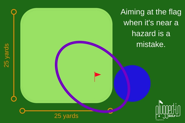 The common push back to this thinking is that you won’t make as many birdies.  That’s not true, largely because you have no chance to make birdie from the hazard.  Even if we concede that aiming at the flag yields more birdies, that difference will not make up for the damage done by missing greens and finding hazards.