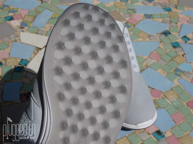 The Moneymaker falls in that sweet spot between a stability shoe and a mobility shoe.  I was impressed with the lateral stability across the bridge of my foot and with the security of my heel.  There’s a good amount of flex at the balls of my feet but nothing close to that of a running shoe.  The length and spacing of the rigid, triangular nubs makes for an aggressive sole design that provided excellent traction.  I’ve observed slight wear from walking between the car and course over several rounds, but nothing alarming.