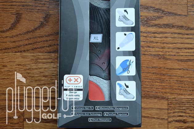 After a simple measurement and cut, the insoles fit perfectly into my golf shoes.  The ergonomic cup heel keeps the insole snugly in place, and the insole doesn’t move around in the shoe.  My feet did fit more snugly than usual on the top of the foot, and my cousin said that was especially so with the high arch.  This is because stock insoles don’t provide a ton of arch support. While the fit was more snug, my feet were still perfectly comfortable and were able to breathe easily.