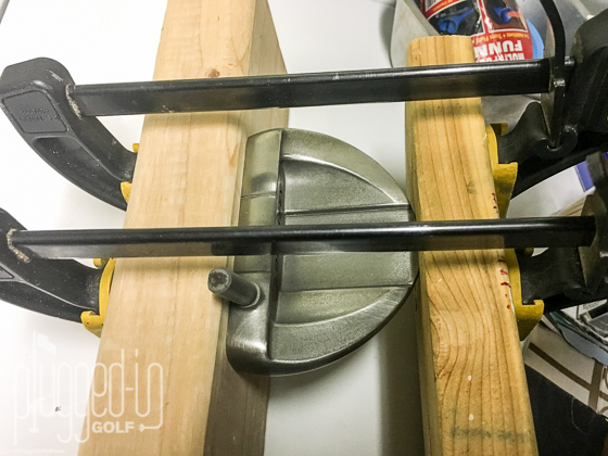 After the sanding and dust inhalation, all that was left to do was reassemble the putter. I used regular shafting epoxy to glue the badge back on the sole and the insert back into the face. I like to clamp the insert in so it stays seated all the way in the pocket and adheres well. Clamping across the whole face was tough because of the shape, so I improvised by using two pieces of wood.