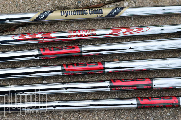 The six shafts used were the Nippon Modus wedge shaft, True Temper Dynamic Gold, KBS Wedge, KBS Tour-V, KBS 610, and KBS Hi-Rev 2.0.