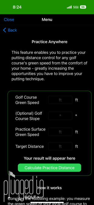 Above on the right, you can see the “Practice Anywhere” mode. This helps you to calculate how the speed of one green will translate to another. If you have an indoor putting green or mat, you can use this mode to help that indoor practice translate more directly to the course.
