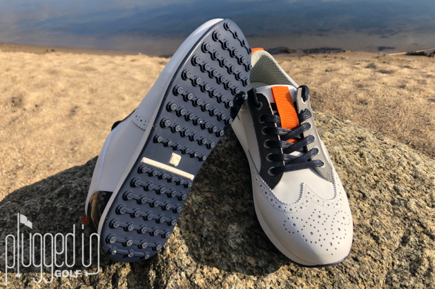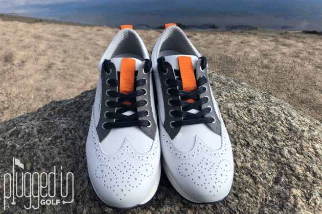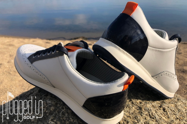 These days, golf shoes fall at some point on a spectrum between athletic-inspired and dress-inspired. The Camelot certainly falls very close to the dress end of that spectrum, but there’s plenty of flair, too. The orange details and patent leather heel cups are details that really help give the shoe a unique personality and an eye-catching look.