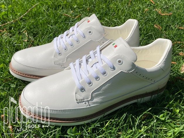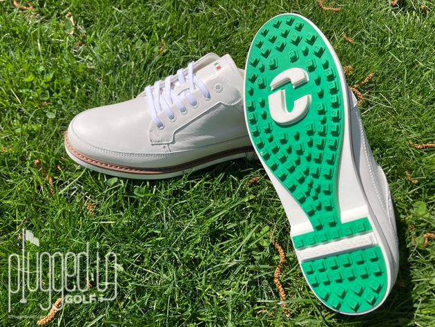 The Duca del Cosma Davinci sticks a bit closer to traditional golf shoes with its all-white upper. This puts the focus on the premium materials. There is a strong injection of color with the green sole. As usual, DDC offers players style options by including a second set of laces – green, in this case – so you can switch up the look in minutes.