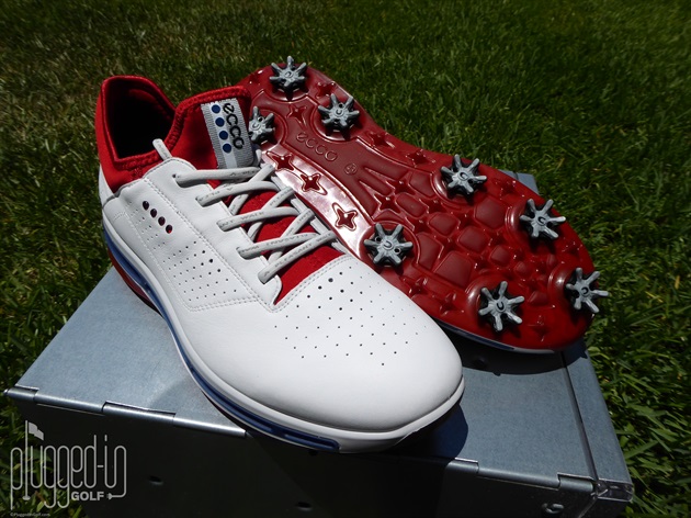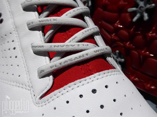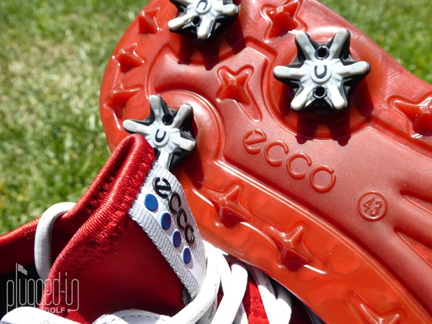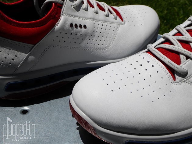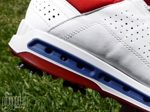 Overall, the ECCO Cool 18 GTX has a contemporary style, with smooth lines and a lot of little holes. Those holes are actually an important performance feature that I’ll elaborate on shortly. Did you notice the red material around the shoe opening is all one piece? Instead of a traditional tongue, the shoe features what ECCO calls a sock liner. The holes and the sock liner are what makes this the “18” version of the Cool GTX. The bottom looks like a modern cleated golf shoe, with molded spikes for additional traction.