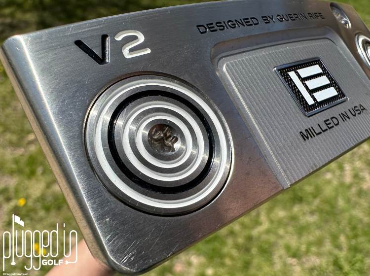 The Evnroll V2 putter is a premium-looking mid-blade that features a series of squared-off lines as your eye moves away from the face. It’s traditional, even down to the color – a satin chrome finish. For alignment, there is only a thin white line on the back flange. The sole calls out the designer of the putter, Guerin Rife, and also denotes that the putter is 100% milled in the USA.