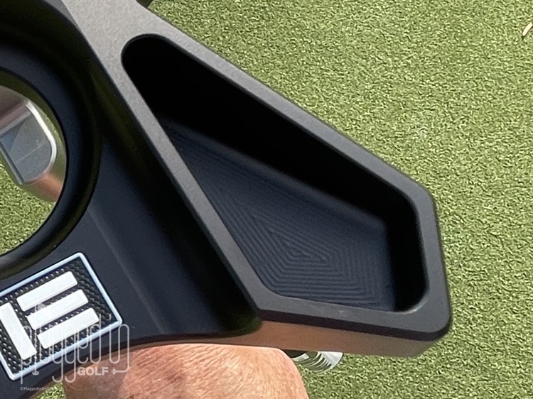 Flipping the putter over, the sole reveals plenty about the design and manufacturing of the Evnroll ZERO Z1. A detail that had eluded me while taking photos was the fine milling lines in the wing cavities. Impressed with that milling, I realized the entire head was milled – including the beautiful curvatures at the circular center. The two weight ports convey a high MOI design. And finally, the signature logo “E” I’d been looking for.