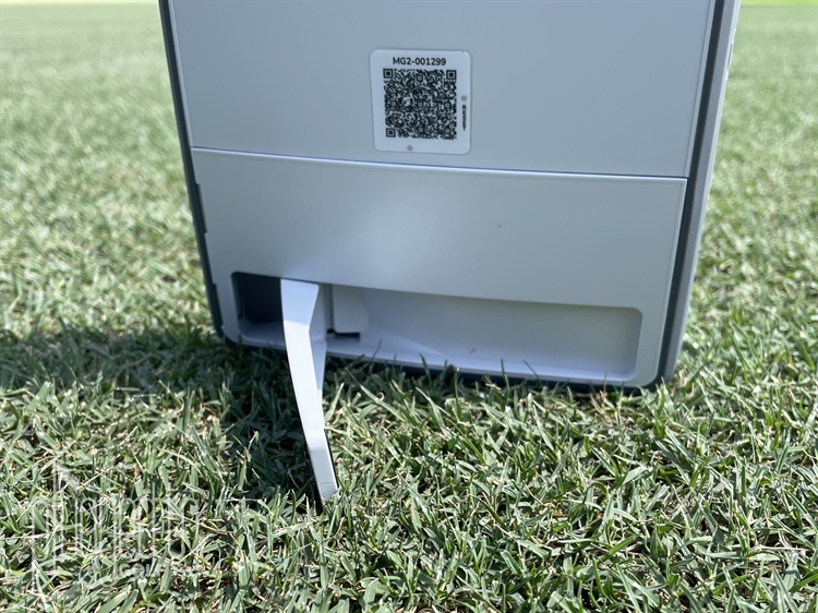 Inside the sleek white box, I found the Flightscope Mevo Gen2 unit, USB-C charger, Quickstart Guide, and aluminum stickers all packed neatly inside the carrying case. The Gen2 was wrapped inside some heavy-duty plastic with a red sticker at the power button directing me to deactivate the shipping mode by plugging the unit in. I pried open the small rubber rectangle next to the power button only to find it was NOT a cover for the charging port – that was easily found on the side.