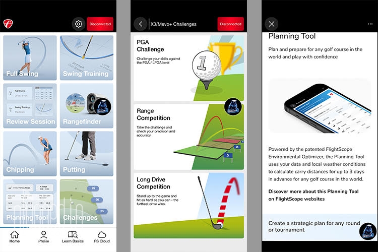 Selecting the “Challenges” feature brings you to three games (see the center graphic above) for having a little fun on the range with some other golfers. I mentioned being able to adjust environmental conditions earlier, but the final home screen option I want to highlight is “Planning Tool.” The graphic above right sums it up nicely. I could see this as a valuable tool for planning for a trip to the mountains of Colorado or the lowest golf course in the world – Furnace Creek [review HERE].