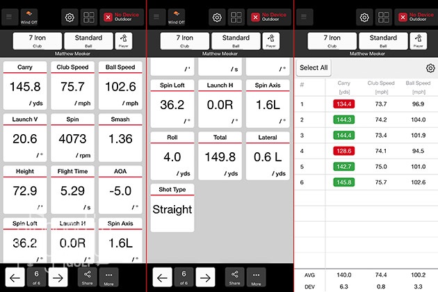 Another feature that’s very effective is data margins. These can be created utilizing any or all the parameters by inputting upper and lower limits. I created a 7 iron margin with a lower limit of 140 yards and an upper limit of 160 yards. I applied it to the 7 iron session displayed throughout this review. Whether in the graphic views or in the shot list (above right) the red and green visual alerts are a great way to quickly analyze consistency.