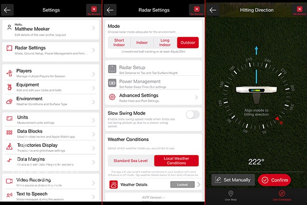 As you can see from the graphic above left, the Mevo+ provides a vast amount of setting options and features that you can turn on/off. For those Bryson-level folks who want to deep dive into data, the Mevo+ can adjust for local weather conditions, and you can select soft/medium/hard surface types. Just remember to allow location during setup or on the phone settings page – I had dismissed it initially. The phone will have to be connected to the unit for the weather conditions to load. You’ll also need to confirm which direction you are hitting. The Mevo+ also provides seamless video clipping to assist in swing analysis.