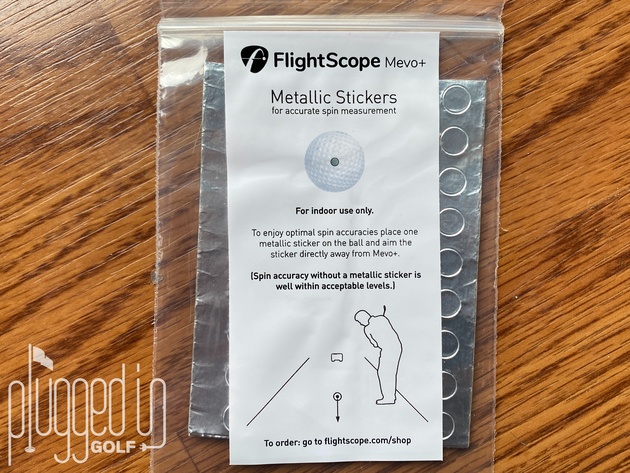 One of the things that’s unique to Mevo and Mevo Plus, compared to any other personal launch monitor I know of, is the suggested use of metallic dots on the golf ball. As it says on the bag, this is only for indoor use, and FlightScope insists, “Spin accuracy without a metallic sticker is well within acceptable levels.”