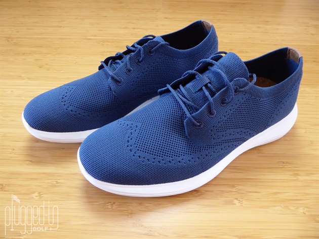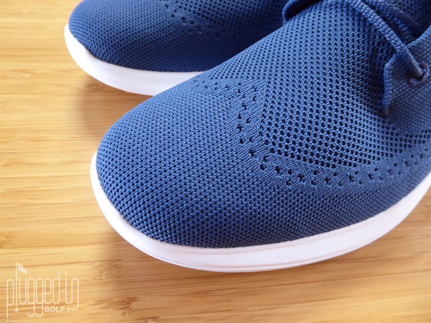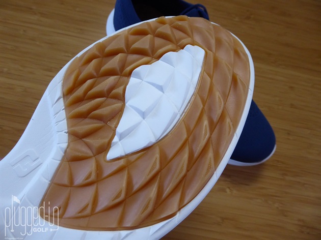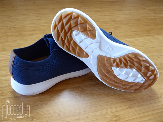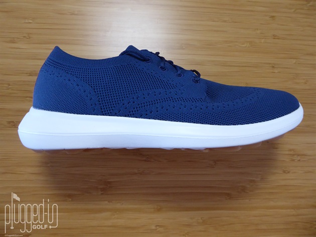 On point with its trendy knit upper, the Flex LE2 really look sharps with wingtip detailing. Weave density adds visual interest to the solid deep blue uppers. The thick white midsole may be a bit dominating for some, but it completes the modern, upscale, casual athletic look. The simple brown leather strip down the heel displays FootJoy’s attention to detail and coordinates nicely with the brown sections of the outsole. And in a first for me – no branding on the uppers, just a small simple “FJ” on the sole.