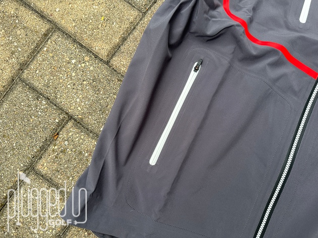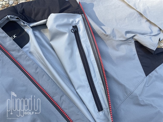Sticking with the zippers, both jackets feature a smart array of waterproof, zippered pockets. The HydroTour has two hand pockets as well as two chest pockets – one interior, one exterior. FootJoy’s HydroLite X jacket has two hand pockets and an interior chest pocket. Matt Meeker noted that the pockets have excellent depth, which really adds to their usability. A pocket is no good if your stuff is constantly falling out of it.