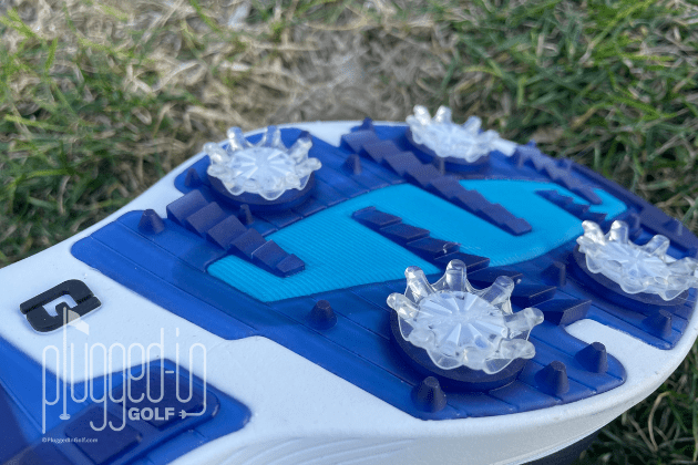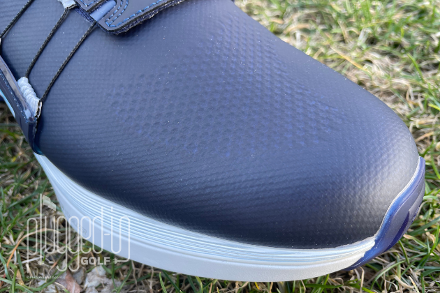 The entire toe box, mid sole and saddle use a 100% waterproof material called integrated thermoplastic. This makes these ideal for any condition whether it’s dew from the early morning or damp from recent rains. My second round testing was an early morning tee time and not only were my feet dry the whole round, the excess grass clippings wiped right off before heading home.
