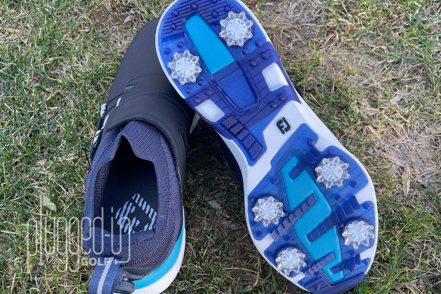 The FootJoy Hyperflex BOA golf shoes have a clean, athletic look. No oversized logos or busy designs, just clean lines that pair nicely with almost any style. The all-navy shoe is largely covered by a thermoplastic material over the toe box and mid sole while the upper rear of the shoe and foot insert is surrounded by a soft stretchy knit. The navy is only broken up by hints of light blue and white that run along sole which hosts six replaceable fast twist 3.0 spikes.