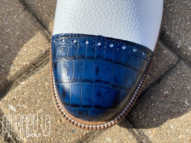 The FootJoy Premiere series covers three different styles of shoe. The blue and white shoe seen in this review is the Tarlow. The Tarlow is also available in all black and all white. There is the Packard, a spiked shoe with a slightly less flashy look, available in white (shown here), black, and white/navy/red. The Packard is also sold as a spikeless shoe in grey. Finally, there’s the spikeless Flint, available in white, navy and black.
