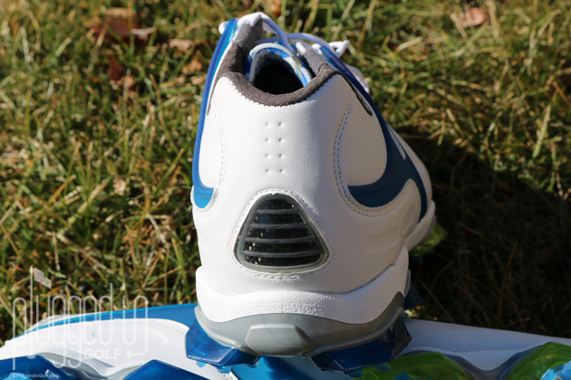 When you look at the sole of the Tour S, your eyes are immediately drawn to the nine “FJ Launch Pods.” The purpose of these pods is obvious: like outriggers, they make the sole wider in the heel and forefoot to enhance stability. In this regard, they are a tremendous success. There was nothing I could do to lose my balance when swinging in the Tour S.