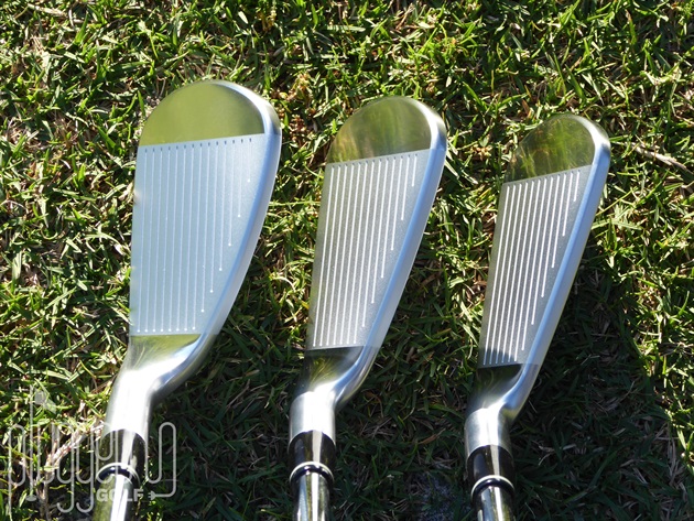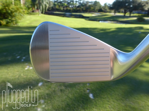 At address, the topline is perfectly on point with the targeted player profile – thin for wonderful visual appeal, yet long enough to not be intimidating.  Face on, the TB-5’s have a bit more of a game improvement look due mainly to the height at the heel.  However, the contrast in finishes and absence of paint fill in the grooves maintains an overall attractive look.