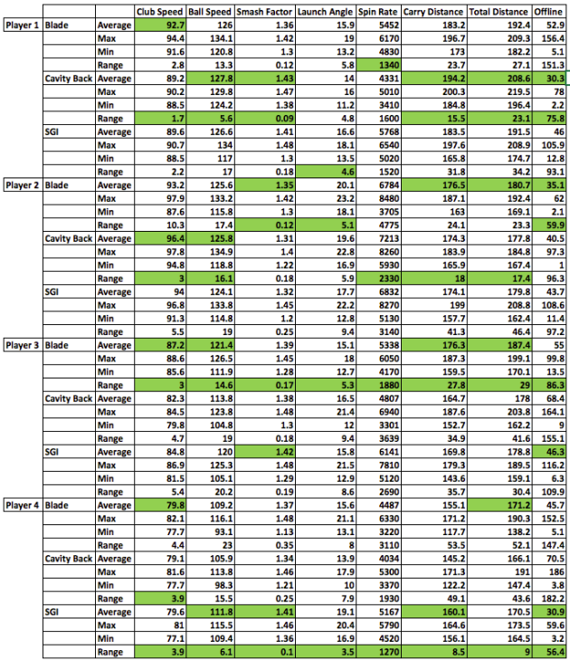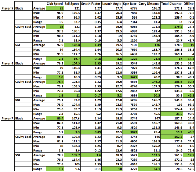 Looking at the group average, smash factor was the highest with an SGI iron despite poorer ball striking. Similarly, no player in our group hit their longest shot with a blade.