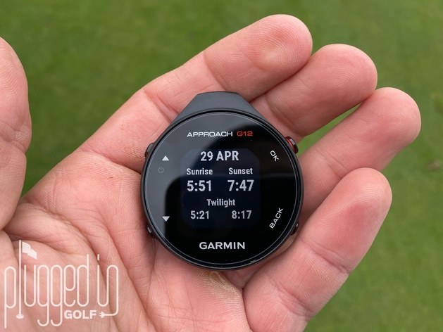 In addition to the hazards, the Approach G12 has several smart “bonus” features. There’s a digital scorecard which can sync with the Garmin app. You can measure your shot distances with a couple button pushes. It also shows you the times for sunrise and sunset. Finally, there’s a green view that allows you to move the pin to get better yardages. The pin can’t go anywhere – it rotates among several set locations – but it’s a nice way to see the green shape and perhaps chase that elusive ace.