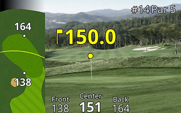 Selecting PLAY GOLF engages satellites that find the nearest course(s) and asks you to confirm the one you are playing. After that, the unit automatically identifies the closest hole and displays it on the left side of the screen in stunning color. Getting distance to an object is as simple as holding down one button.