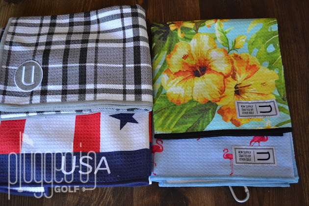 Uther currently offers two types of towel: the Tour and the Cart towels. The cart towels come equipped with a carabiner for easy attachment to your bag. The Tour Towel is a much larger towel, with a putter slit in the middle, so that you can hang your towel off of the side of your bag, while having easy access to carry it to the putting green.