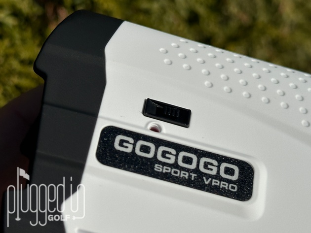 Like the GS03, the VPro GS24 has three modes of operations, though only two are relevant to golfers.  In M1, the device gets straight-line distances at blazing speed and can scan as you aim at different things.  M2 activates the pin lock, vibration alert, and the possibility of slope adjustment.  To get slope-adjusted yardages, you need to be in M2 and have the slider pushed forward.  A red light below the slider lets you know if you’re in slope mode or not.