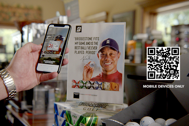 COVINGTON, GA – Bridgestone Golf, the #1 Ball-Fitter in Golf, announced today the introduction of the BRIDGESTONE GOLF EXPERIENCE, a way to bring Tiger Woods and other Bridgestone TOUR players directly into your living room, pro shop, or clubhouse. With the BRIDGESTONE GOLF EXPERIENCE, consumers can utilize an augmented reality web application on their smartphone to see and hear Bridgestone Tour Staff members talk about the TOUR B model they play and learn why it might be a good fit for them.