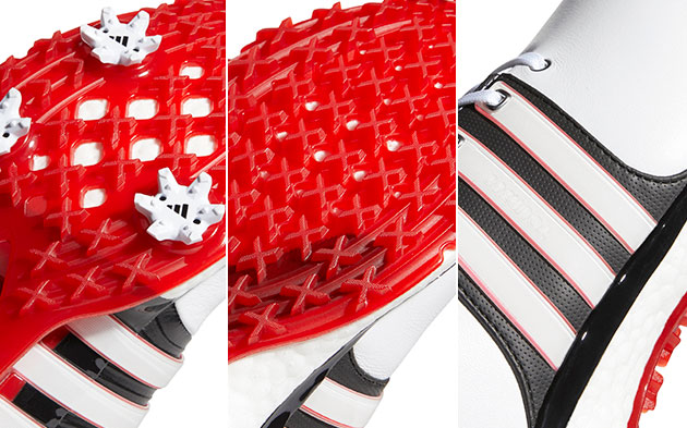 The TOUR360 XT is completely redesigned. One of the key features is the new TPU outsole. adidas implemented a new eight-spike execution in combination with the X-Traxion secondary lugs for additional grip and stability. By removing two spikes from the previous model, adidas increased flexibility and comfort while decreasing overall weight, benefits all golfers are looking for. BOOST, the best cushioning in the game, has also been re-engineered from heel to toe. BOOST pieces in the heel and forefoot are now slightly wider and move through larger expansion holes on the bottom to improve both stability and comfort. The new BOOST cushioning has a lower-profile execution for improved aesthetics while also giving players a better feel with the ground. Underneath the 3-Stripes in the TOUR360 XT, adidas implemented the new forging technique by heating that portion of the upper to increase stability in the midfoot while also reducing overall weight of the shoe. It features a rich premium leather upper that comes with a two-year waterproof warranty. It will be available in four colorways.
