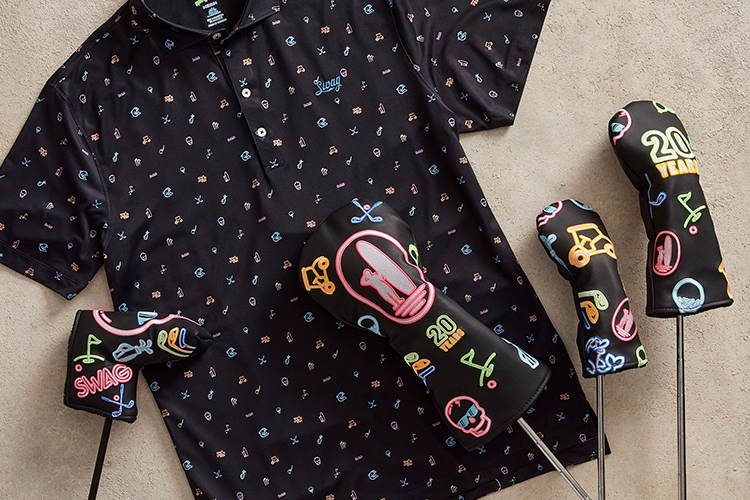 The collection features three distinct capsules—Neon Nights, Chicago Style, and Icons—each inspired by popular elements that shaped Johnnie-O and SWAG Golf into the brands they are known for today. As part of Johnnie-O’s 20th anniversary, the Neon Nights collection brings electricity to golf bags and outfits with hand-drawn designs that mix the iconic Johnnie-O Surfer Dude and 20-year logos with SWAG Golf’s signature skulls and dolphins, along with other playful golf references.