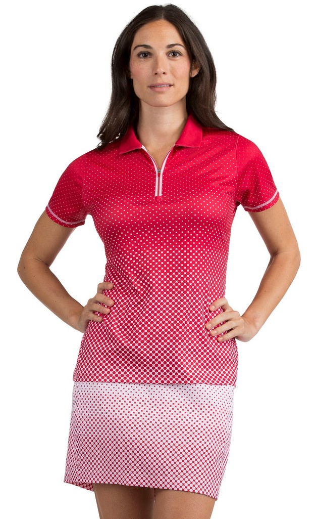 The Friday outfit for the first day of competition (shown above) at the 2017 Solheim Cup features a new take on polka dots – the red and white print Ascend polo is matched with the Ascend skort and short that sport a mirrored version of the same print, in white with red dots. The gradient dotted pattern creates an optical illusion.