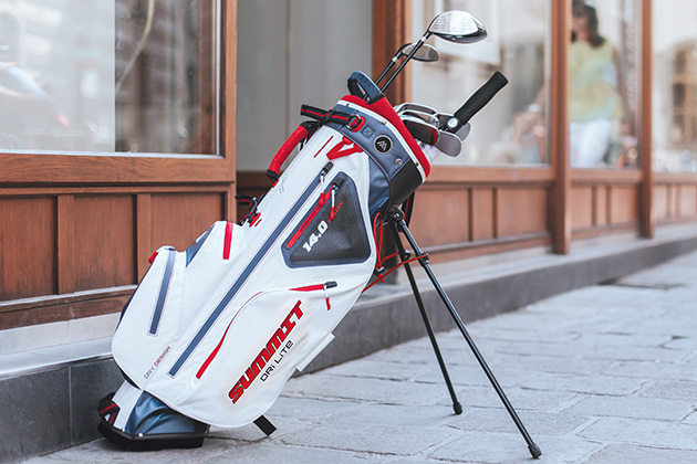 Off the cart, the Summit performs just as well. Padded straps with air channel for breathability deliver comfort while the weight of 4.4lbs is incredibly light for such a feature rich model. 14 way divider top and 7 spacious pockets takes care of all your equipment organisation while the 100% waterproof, lined valuables pocket protects your most important items. An oversize cooler pocket gives plenty of space for chilled beverages and neat features such as glove holder and umbrella holder provide comfort and convenience on the course.