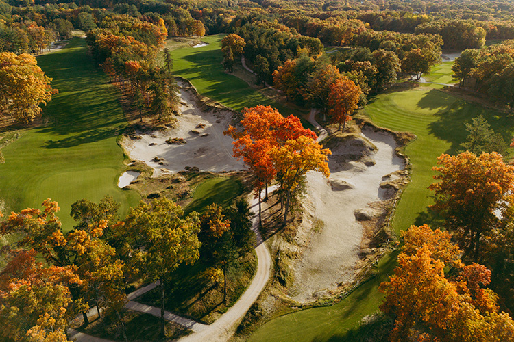 Many of the greens are also canted from front-to-back, rather than the more typical back-to-front arrangement. This will further entice players to consider bouncing their approach shots into an interesting variety of hole locations. The greens themselves are fairly large, ranging from 4,200 sq. ft. (short par-3 16th) to 10,800 sq. ft. (long par-3 third). Playing corridors are quite expansive, as the course features some 55 acres of fairways. The holes are frequently framed by pitch pines, a species that thrives in the sandy pockets of soil sporadically found across New England, Long Island and New Jersey.