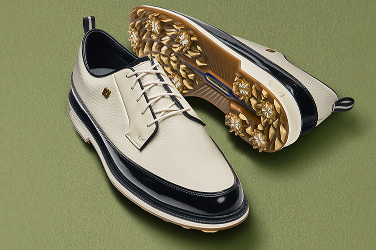 With deep roots and strong foundation in authentic styling, the shoes reimagine FootJoy’s iconic silhouette through a modern lens. A full-grain pebbled leather upper is paired with a high-gloss black patent leather rand, a striking contrast inspired by the bold aesthetics of late ’90s performance footwear.